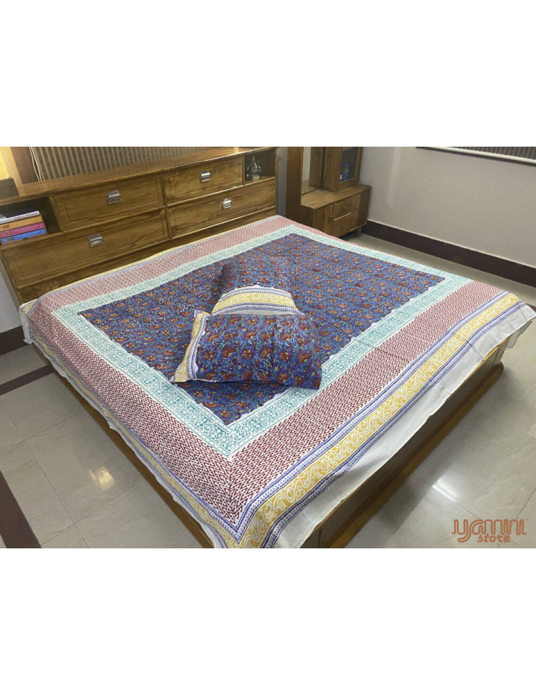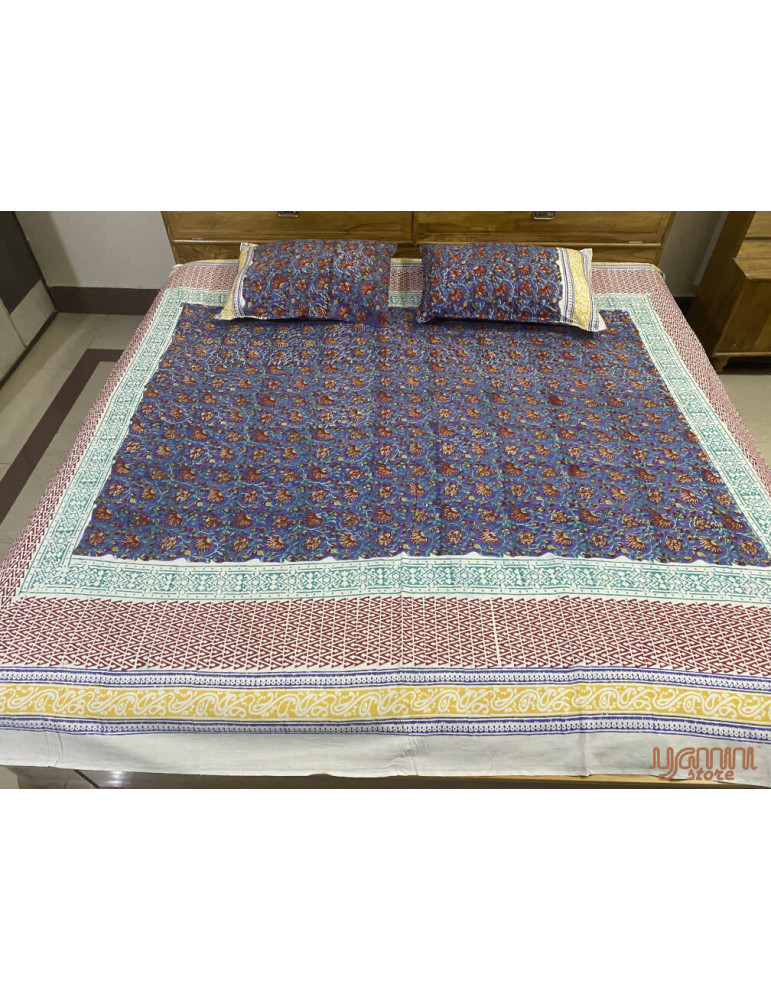 Blue Floral Print Premium Hand Block Printed Cotton Bedsheet With 2 Pillow covers