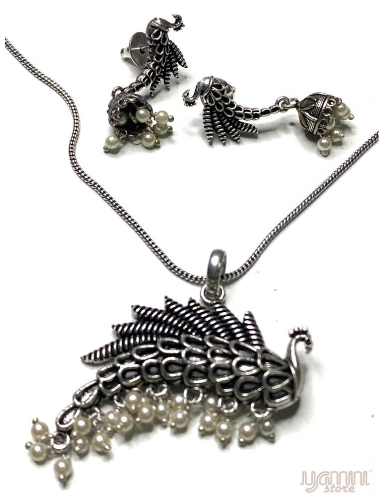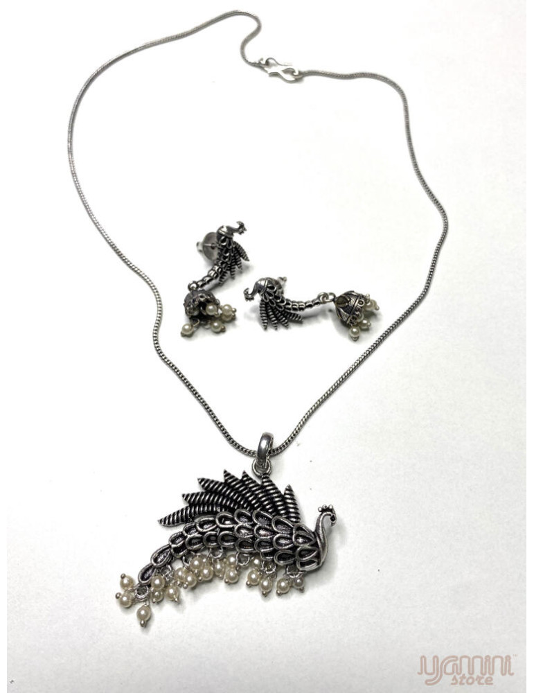 This piece of oxidized antique necklace is a perfect outfit for any traditional /modern outfit with an elegant look. This is having an exemplary finishing texture and affordable price. It is crafted in German silver-containing mustard-like beads in the Pendant.