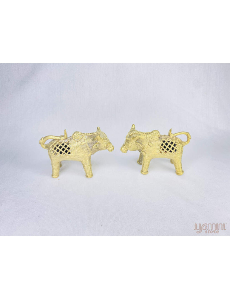 This handcrafted "Bull Set" is an elegant Dhokra metal cast home decor made by the Damar Tribe of Odisha. It is a tribal art form and is completely handcrafted. This is a 4000-year-old non-ferrous metal casting started at the dawn of (Mohenjo-Daro and Harappa) civilization and tribal people are still maintaining their legacy. It is made by the lost wax technique and uses brass metal, clay, bee wax, cow dung, resin, and nut oil. to prepare this unique art.