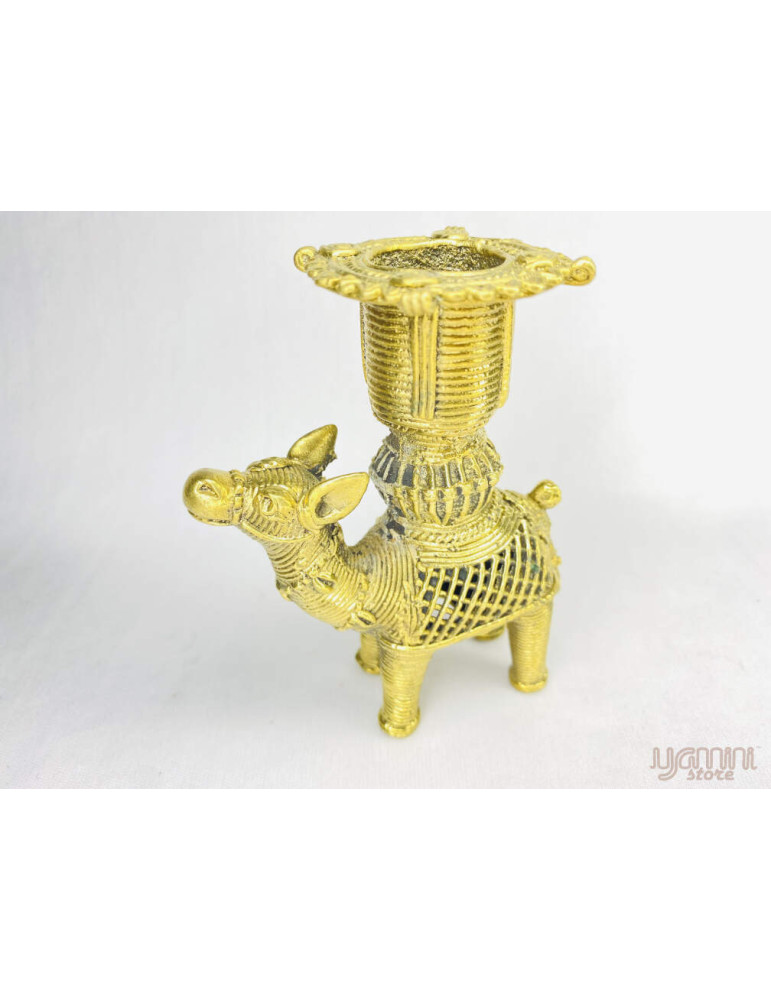 This figurine of  "CAMEL Candle Stand" is a Dhokra Metal Casting made by the Domar Tribe of Odisha. It is a tribal art form & completely handcrafted.The artisan behind this antique piece is a National Awardee named Golapa from Domar Tribe Odisha.