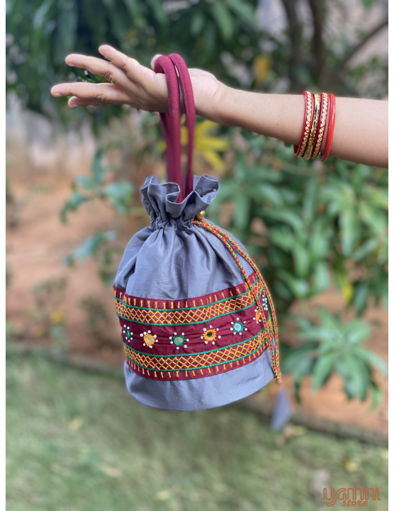 Pure Handloom Aplic work handbag Bluish Grey Maroon