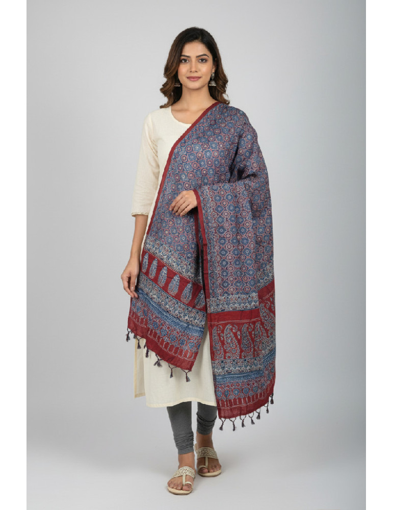 Exclusive hand dyed Ajrakh Hand Block handcrafted cotton dupatta. made in the shades of red and black ,very exceptional this Ajrakh dupatta is perfect combo of sophistication and culture. Made by artisans from Rajasthan, India.
