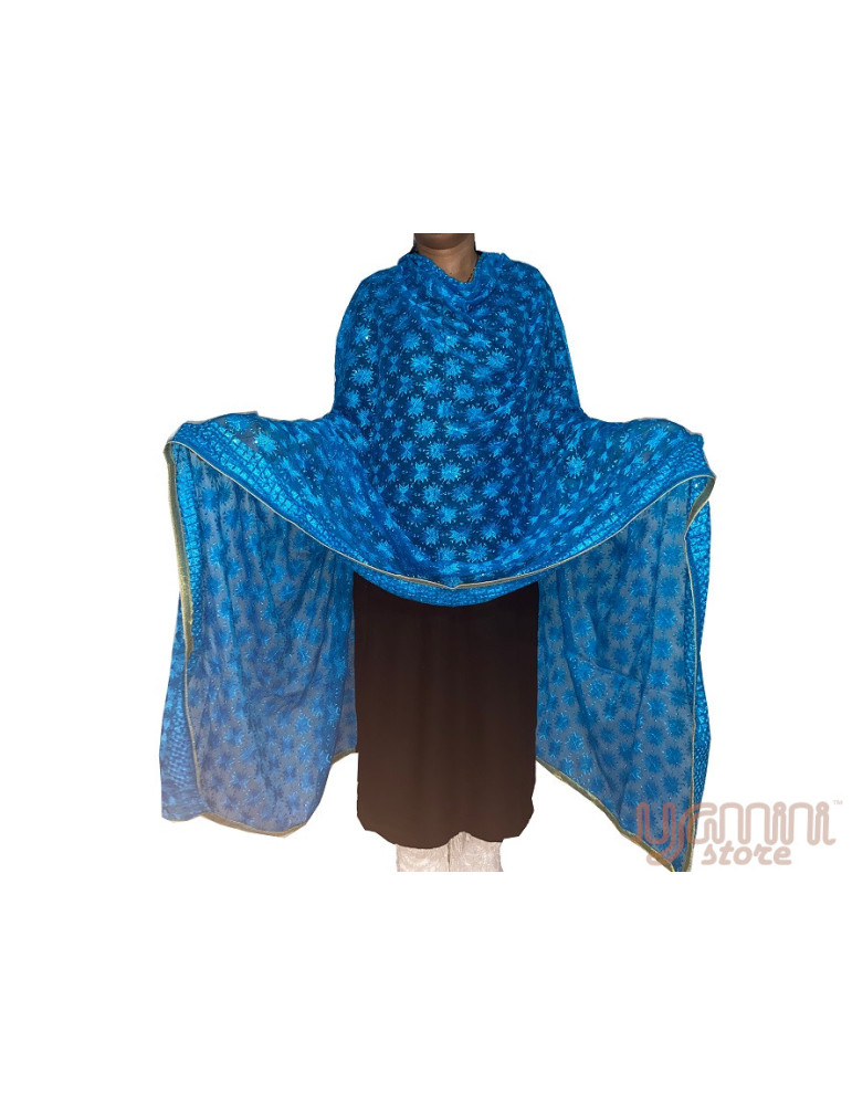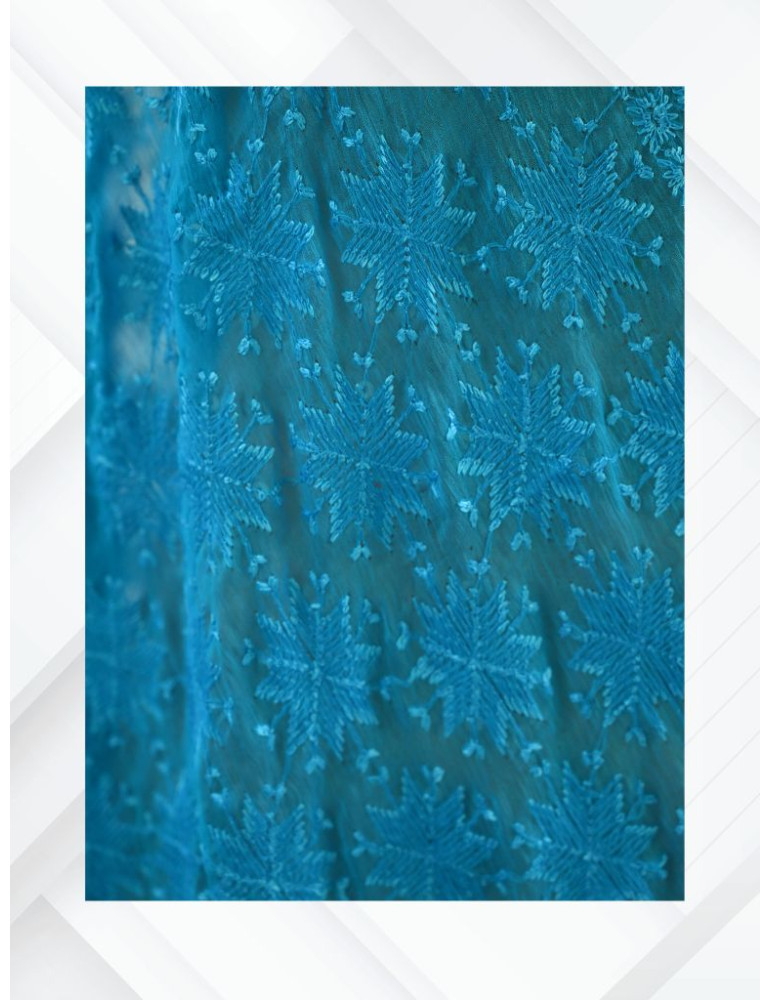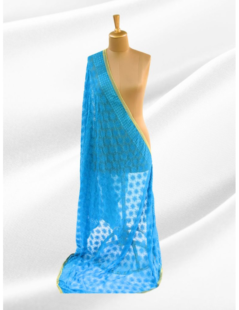 This copper sulfate chiffon dupatta is adorned with beautiful multicolored Phulkari Embroidery with sequence work exalting lavish elegance.