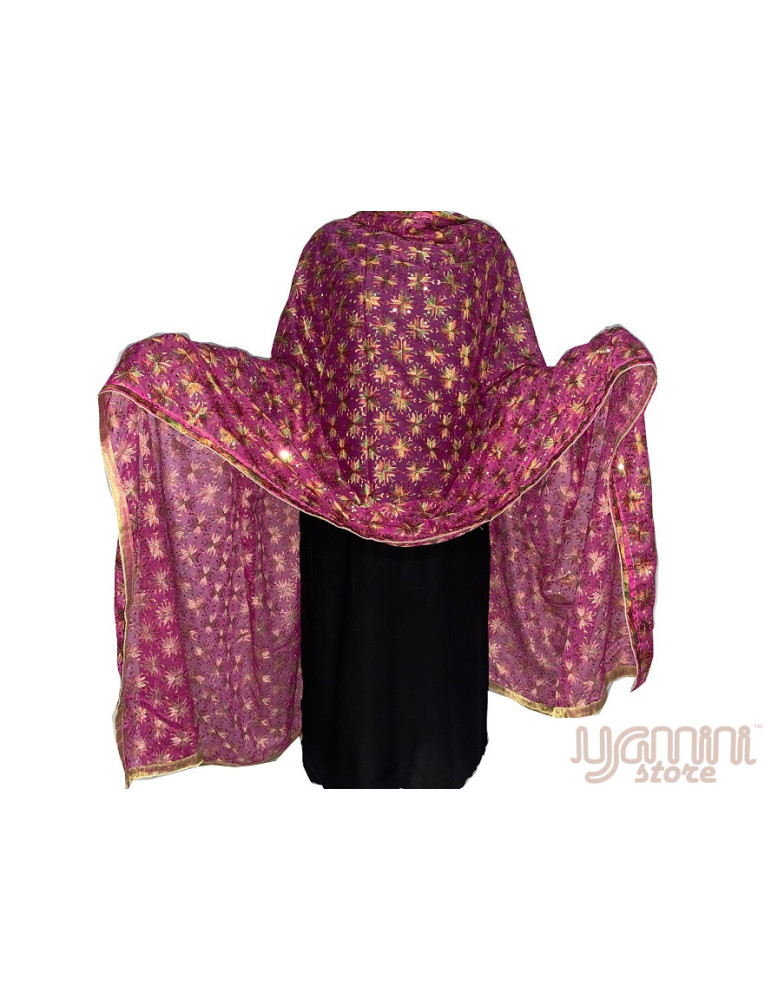 This magenta chiffon dupatta is adorned with beautiful multicolored Phulkari Embroidery with sequence work exalting lavish elegance.
