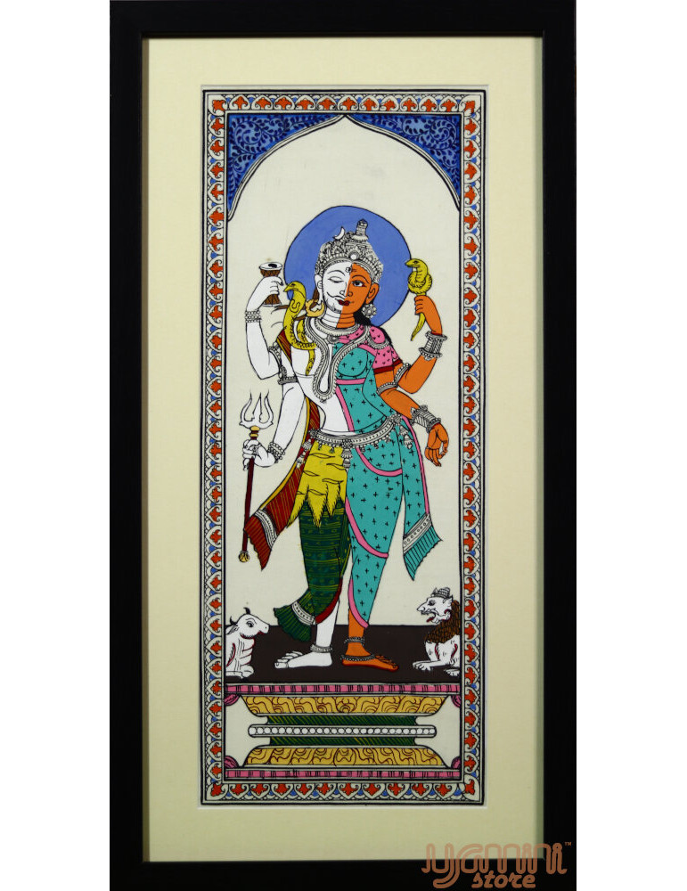 This Pattachitra describes "The Ardhanarishvara (Sanskrit: अर्धनारीश्वर, Ardhanārīśvara) meaning "The Half-female Lord", is a form of the Hindu deity Shiva combined with his consort Parvati. Ardhanarishvara is depicted as half-male and half-female, equally split down the middle. The right half is usually the male Shiva, illustrating his traditional attributes.