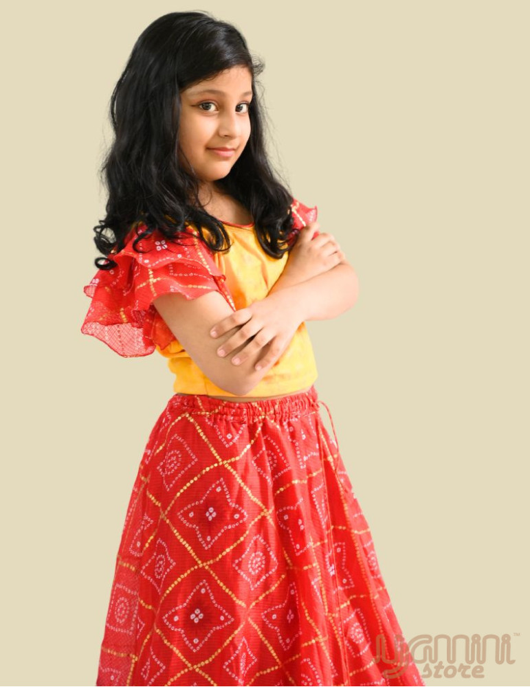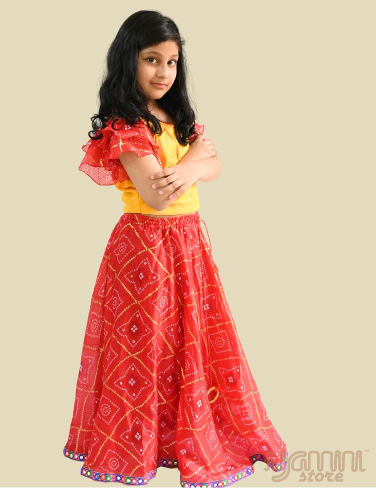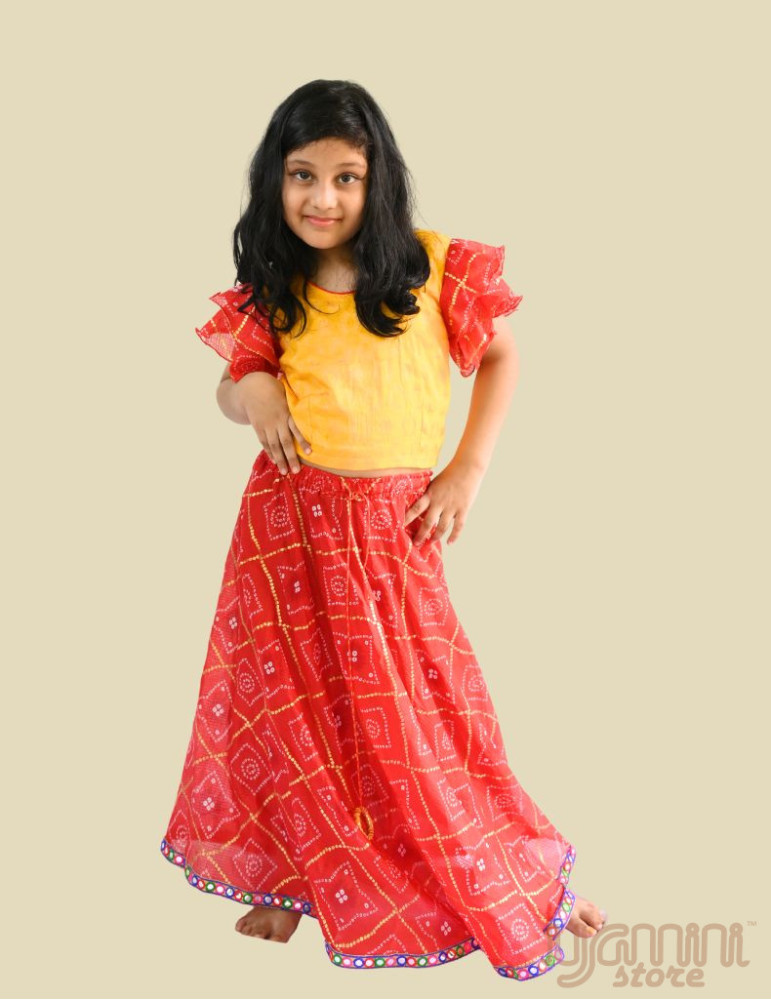 Girl Bandani Print Lehenga Choli with Dupatta (Set of 3) - Yellow Red