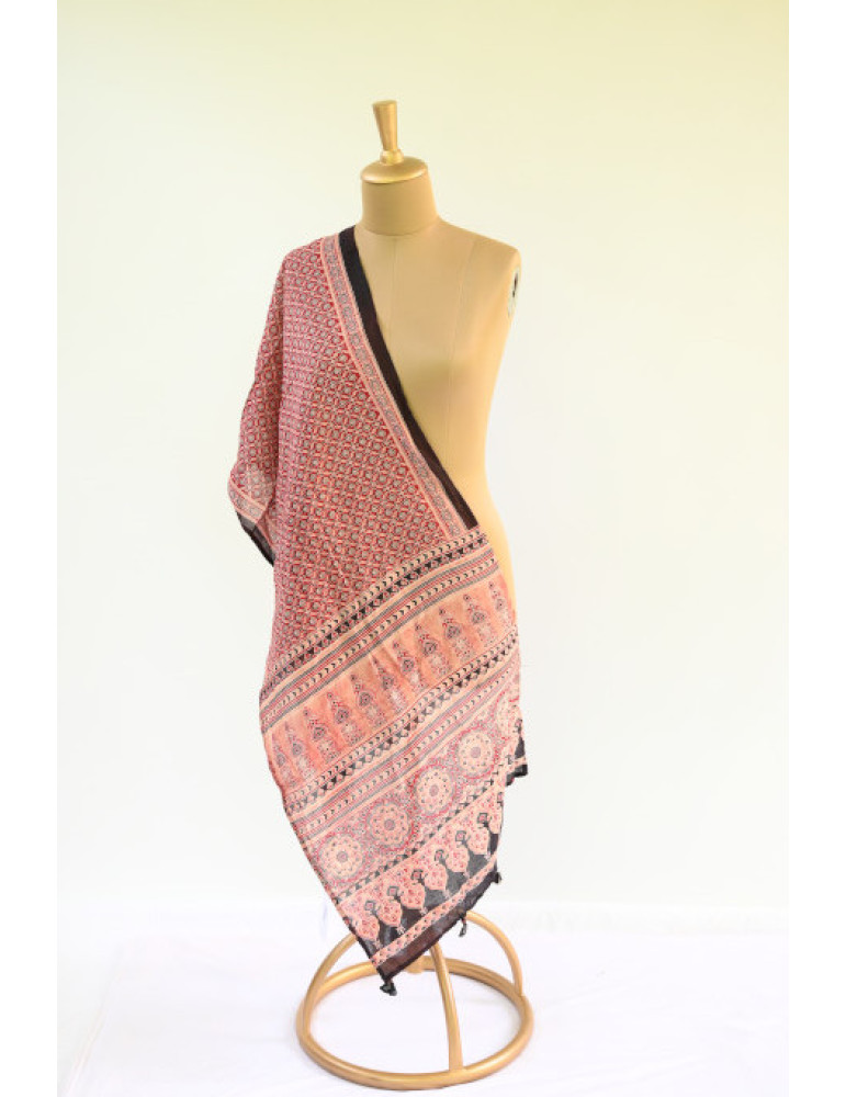 • Yamini Black Peach Shade Ajrakh Handcrafted Cotton Dupatta