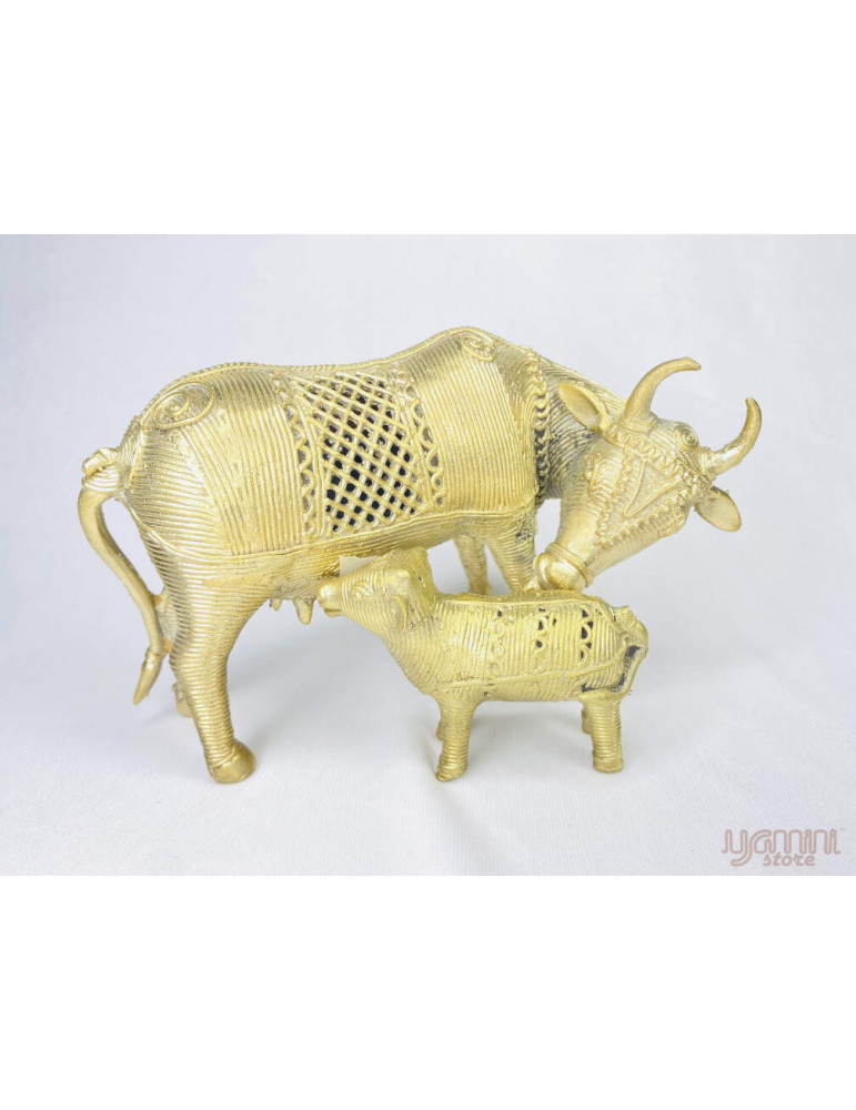 This handcrafted "Cow and Standing Calf" is an elegant Dhokra metal cast home decor made by the Damar Tribe of Odisha. It is a tribal art form and is completely handcrafted. This is a 4000-year-old non-ferrous metal casting started at the dawn of (Mohenjo-Daro and Harappa) civilization and tribal people are still maintaining their legacy. It is made by the lost wax technique and uses brass metal, clay, bee wax, cow dung, resin, and nut oil. to prepare this unique art.