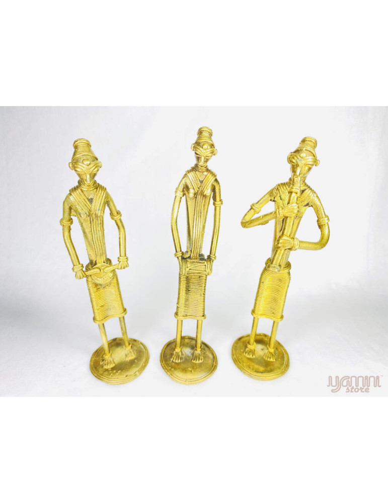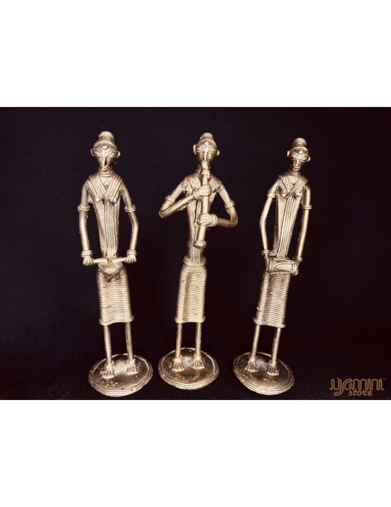 This figurine of "Tribal Musician Set" is a Dhokra Metal Casting made by the Domar Tribe of Odisha. It is a tribal art form that is an amalgamation of their culture with induced antiquity.