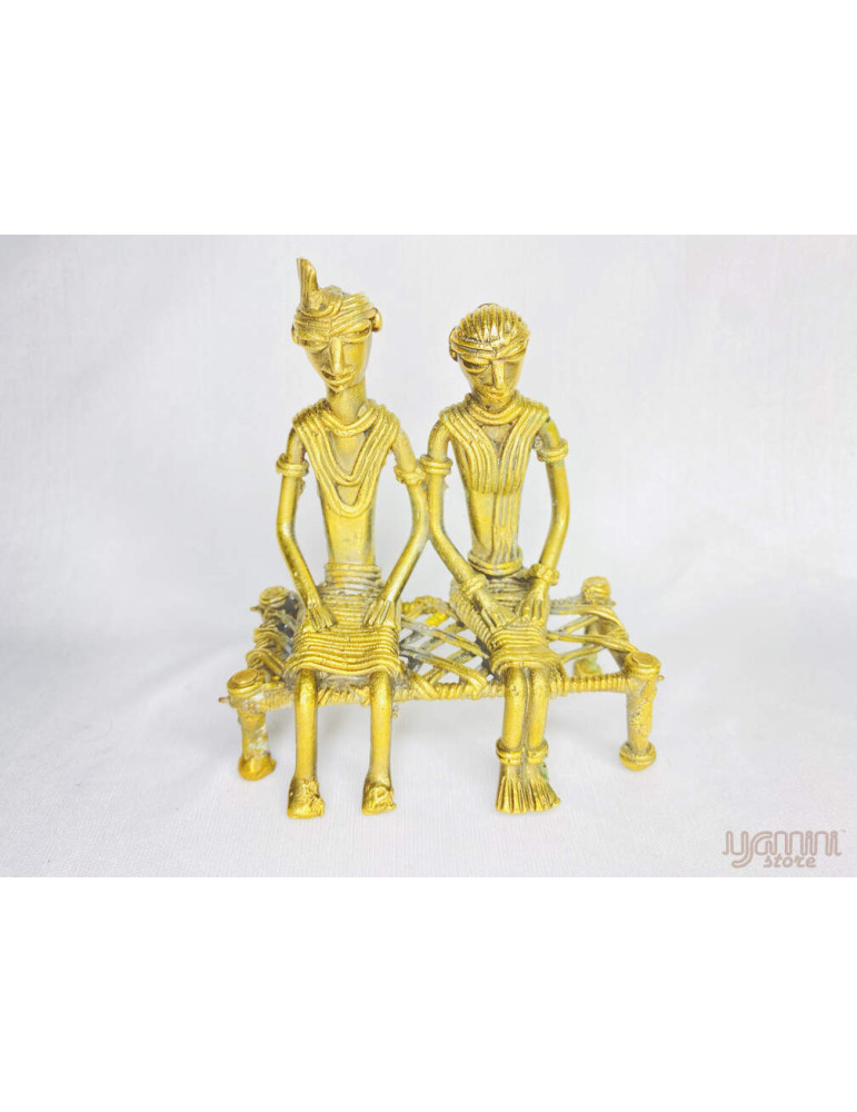 This figurine of "Tribal Couple On a Cot" is a Dhokra Metal Casting made by the Domar Tribe of Odisha. It is a tribal art form that is an amalgamation of their culture with induced antiquity.