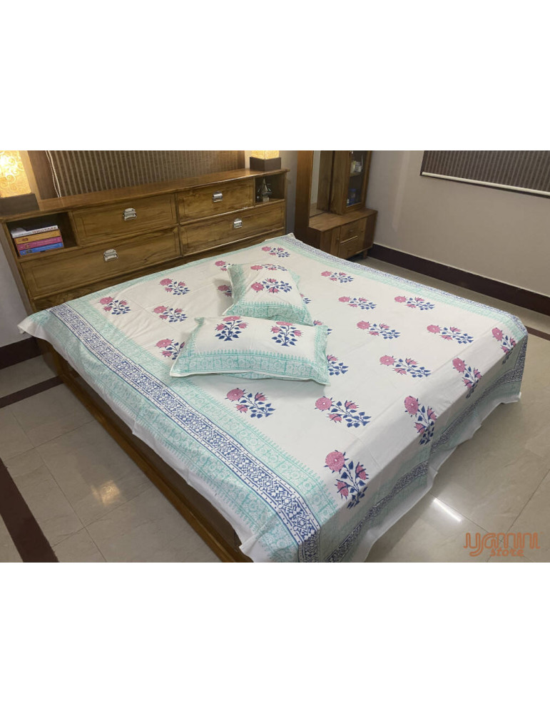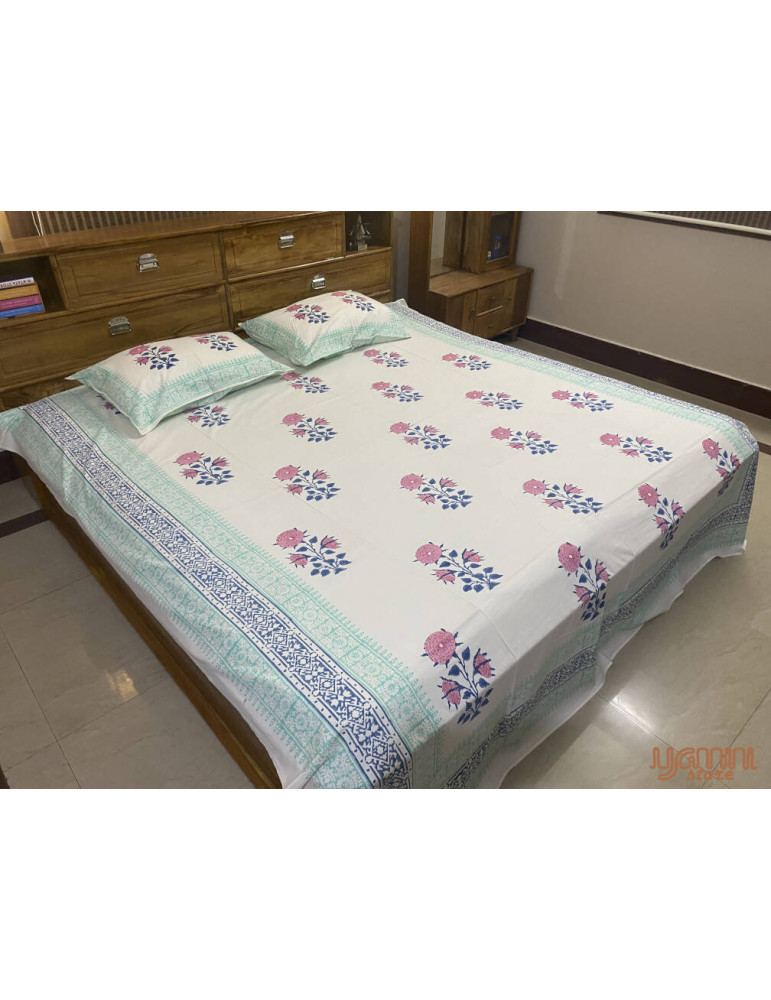 Handloom Pure Cotton Floral Pattern Hand Block print Double Bedsheet with Pillow Cover